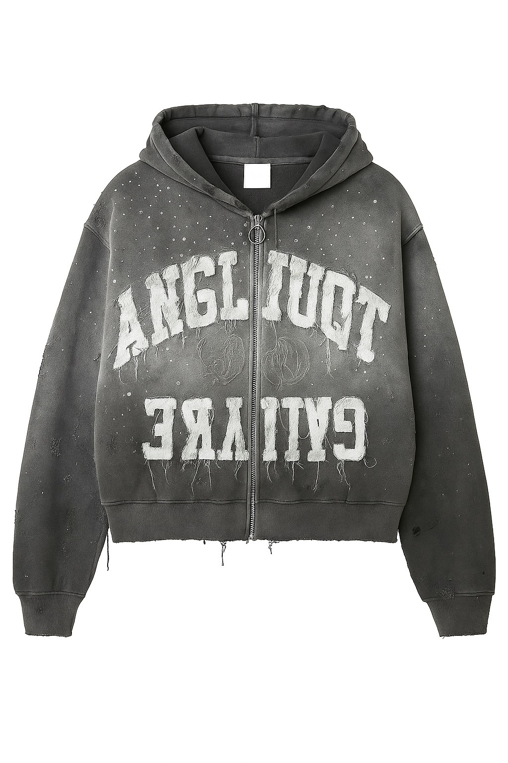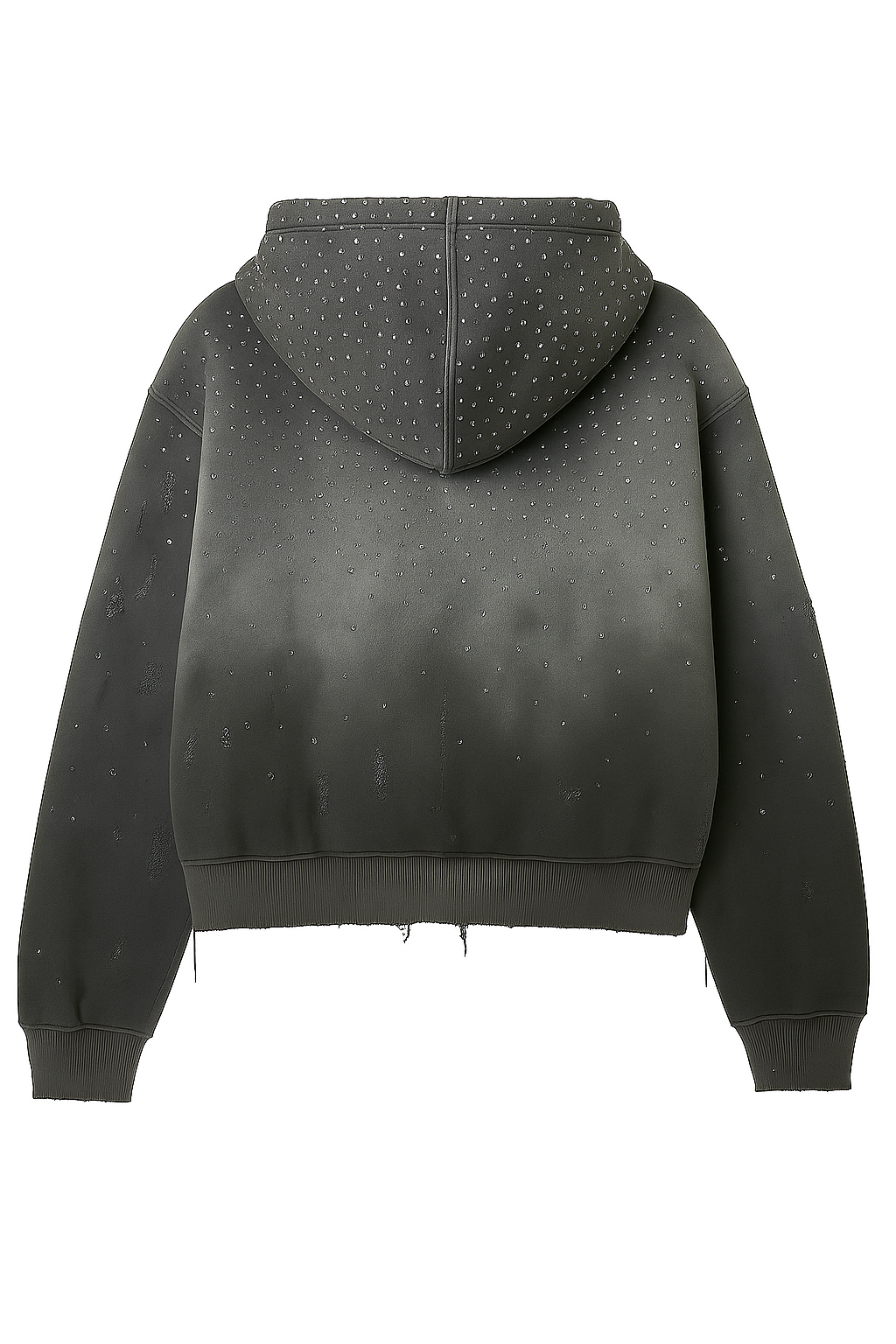 Details: Distressed appliqué graphics, hand-finished wash, metal zipper closure, raw hemline with multisized rhinestones.